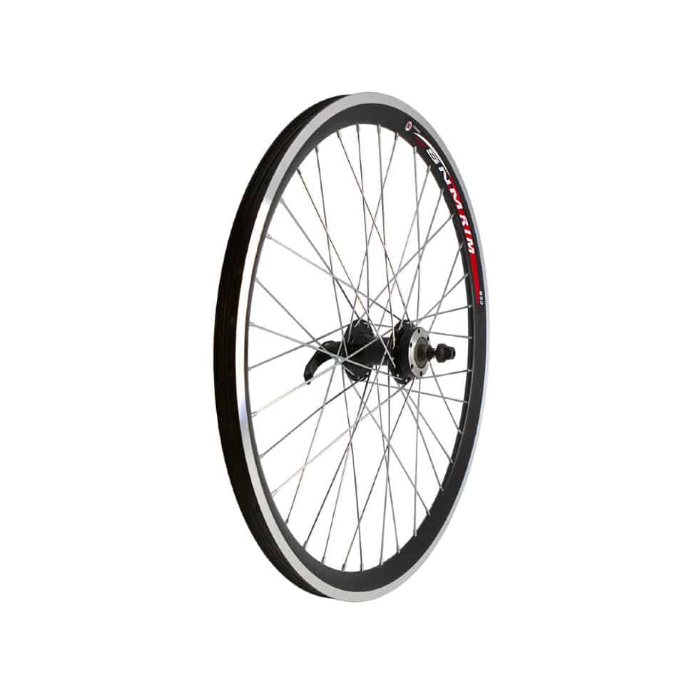 Важнейшая часть велосипеда — это переднее колесо, отвечающее за точность рулевого управления и равновесие. Переднее колесо с диаметром 24 дюйма, качественная замена погнутому или износившемуся старому ободу. Алюминиевый сплав совместно с двойной конструкцией обода отличаются повышенной прочностью, устойчивы к изгибанию и восьмеркам, справляясь с достаточно большими нагрузками. Быстросъемные эксцентрики позволяют поменять колесо за считанные минуты без применения инструментов и не прибегая к помощи мастеров. Установленные спицы в количестве 36 штук, создают достаточную жесткость колеса. Фрезерованные боковины позволяют использовать под ободные тормоза V-brake, а также втулка совместима с дисковой механикой.Особенности и преимущества: